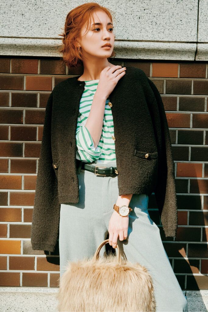 上からかっちりカーデを重ねて。爽やかなグリーンなら、地味色ばかりになりがちな通勤コーデにフレッシュな軽さを吹き込みます。カットソー¥10,780(ザ シンゾーン/シンゾーン 表参道本店)カーディガン¥17,600(emmi)パンツ¥13,900(Gap)ベルト¥23,100(カオス/カオス丸の内)バッグ¥16,500(ダイアナ/ダイアナ 銀座本店)ピアス¥88,000(マリハ)時計¥22,990(クルース/HIROB ルミネ新宿店)