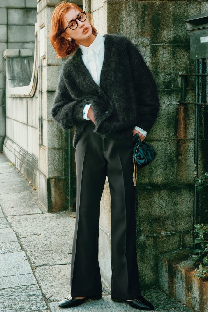 太すぎず細すぎない「センタープレスパンツ」は、体を通すとほんのりフレアに広がる美脚度№1アイテム。ぺたんこ靴でもスタイルに自信が。パンツ¥23,100(ザ シンゾーン/シンゾーン 表参道本店)カーディガン¥97,900(カオス/カオス丸の内)シャツ¥8,910(Mila Owen)バッグ¥20,900(パピルス/アイネックス)シューズ¥24,200(銀座かねまつ/銀座かねまつ6丁目本店)イヤリング¥2,090(アネモネ/サンポークリエイト)メガネ¥42,900(モスコット/モスコット トウキョウ)