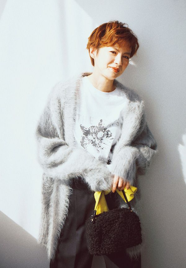毛足の長いアルパカのニットカーデは、プリントTに重ねてボリュームをおさえると◎。カーディガン3万8500円(カレンソロジー/カレンソロジー 新宿) Tシャツ1万1000円(ウィム ガゼット/ウィム ガゼット ルミネ新宿店) パンツ4万1800円(ハイク/ボウルズ) グローブ1万780円(リビエラ/オールド イングランド銀座店) バッグ4950円(ビーミング by ビームス/ビーミング ライフストア by ビームス ららぽーとTOKYO BAY店)