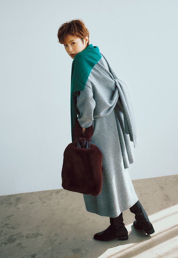 中厚手のしっかりとしたニットワンピと前後で着られるストールジレを重ねた保温性バッチリのコーディネイト。目を引く鮮やかグリーンの三角ストールで垢抜け度数も上昇。ニットワンピース5万2800円、ストールジレ3万6300円、トライアングルストール2万7500円(すべてハウス オブ ロータス/ハウス オブ ロータス 二子玉川店) バッグ2万3100円(ジャッキー/ジャック・オブ・オール・トレーズ プレスルーム) ブーツ3万7400円(ダニエラアンドジェマ)