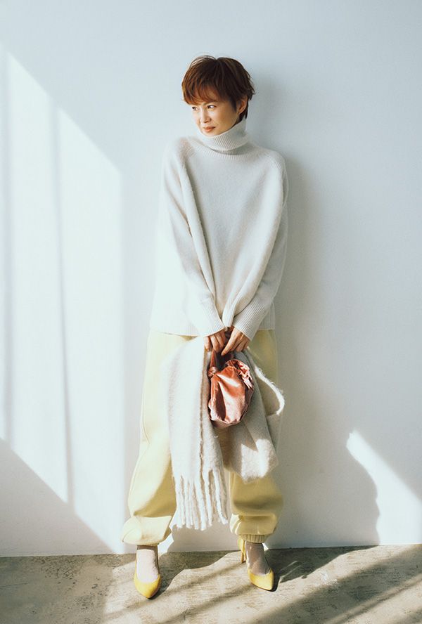 裾ゴムで締まりのあるスエットパンツは、ゆったりとしたカシミヤニットで大人の余裕をプラス。ニット9万7900円(エブール/エブール GINZA SIX店) パンツ3万1900円(オーラリー) ストール4950円、バッグ5720円(ともにビーミング by ビームス/ビーミング ライフストア by ビームス ららぽーとTOKYO BAY店) ソックス3960円(ピエールマントゥー/ピモンテ) パンプス4万4000円(ロランス/ザ・グランドインク)