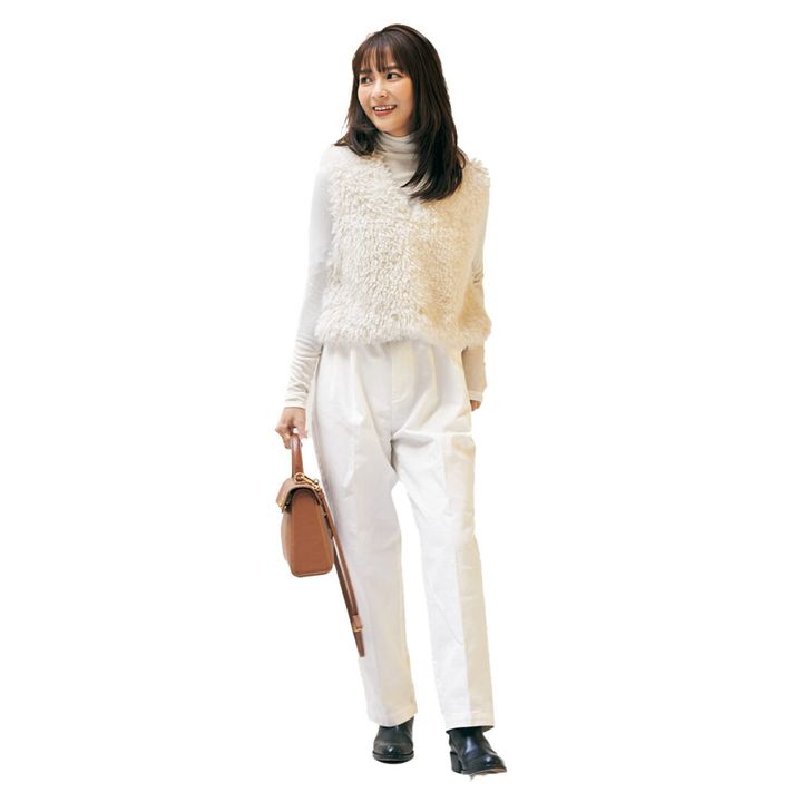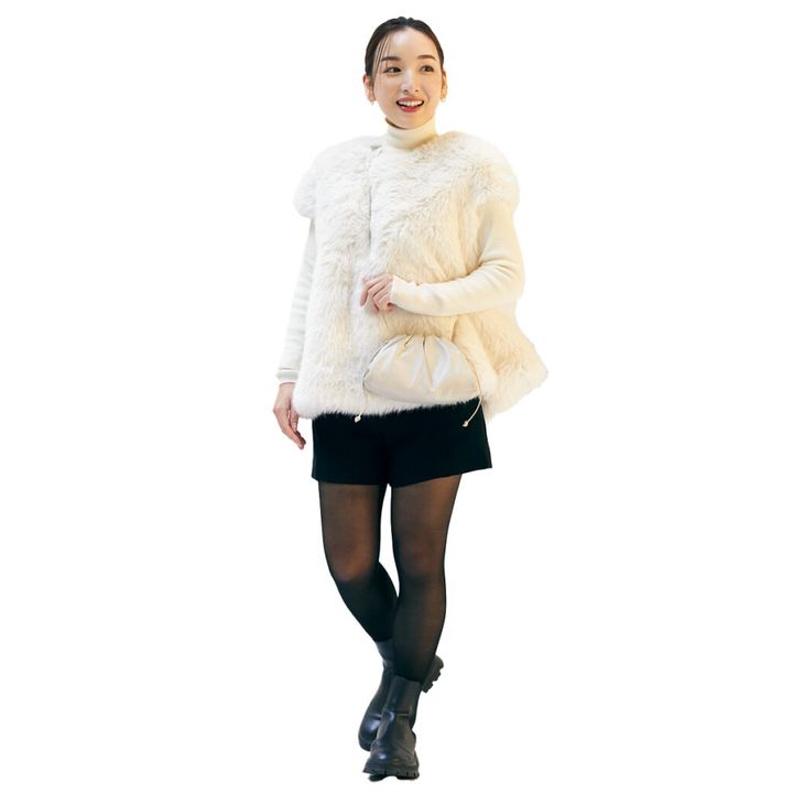 トレンドのベストはふわふわのファー素材に一目惚れ。ボリュームがある分、パンツはミニ丈にしてバランスをとり、色味もモノトーンでまとめました。