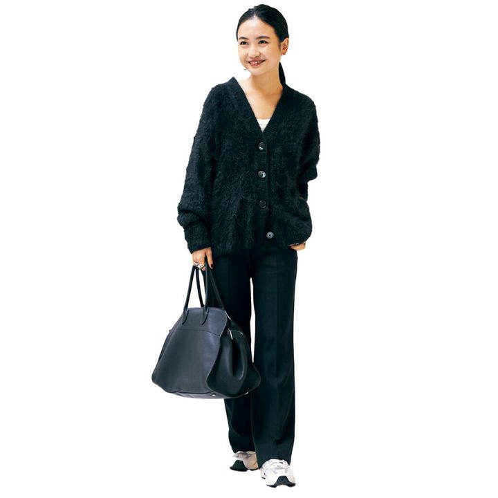 軽量ながらもカシミヤ100%で暖かく着られるお気に入りのニットカーディガン。毛足が長く素材感があるので、黒でも華やかに見せてくれます。