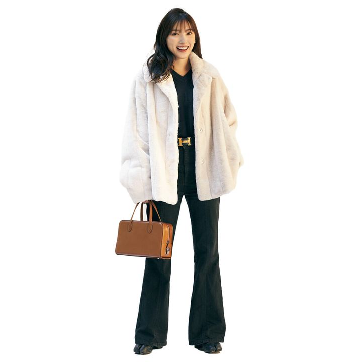 カーサフラインのエコファーコートは程よい丈感でカジュアルからきれいめまで幅広い装いにマッチ。衿が大きめなので、小顔効果も発揮します。