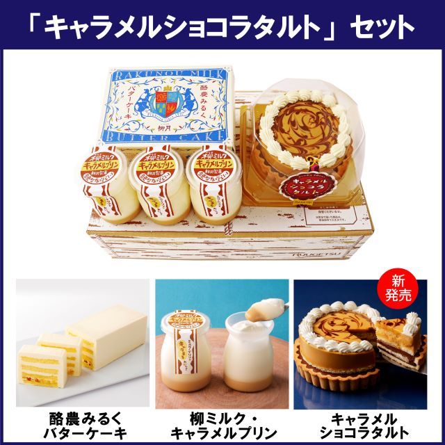 内容 :キャラメルショコラタルト×1、柳ミルク・キャラメルプリン×3、酪農みるくバターケーキ×1「キャラメルショコラタルト」セット