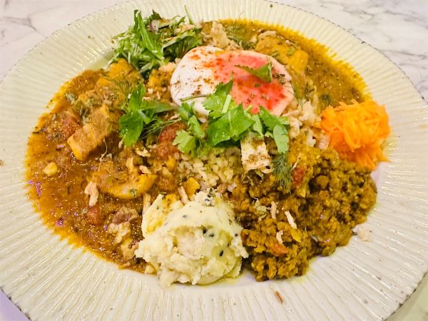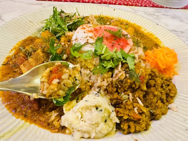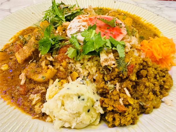 旧水曜チキン、ポークビンダルー、ドライキーマの3種類がたっぷり!見た目も鮮やかで食欲がそそられます。