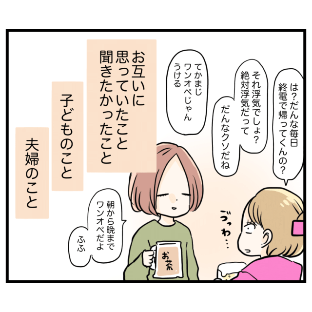 「は?だんな毎日終電で帰ってくんの?それ浮気でしょ?絶対浮気だって。だんなクソだね・・てかまじワンオペじゃん。うける~」