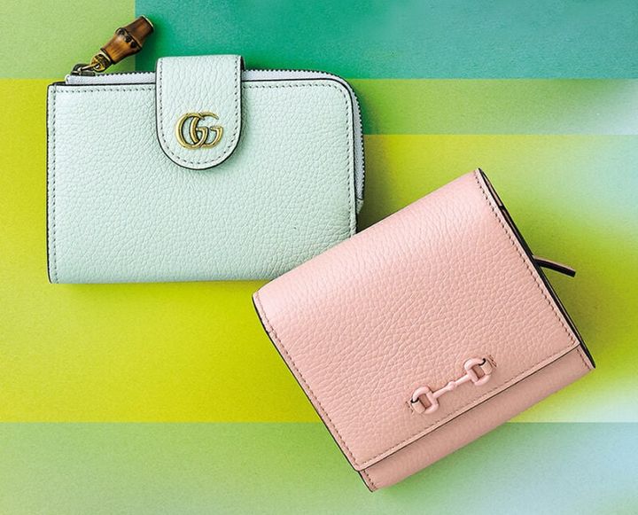 やさしいピンクが恋愛運を応援。同色の小さいホースビットが愛らしい財布は、小ぶりながらカード入れやポケットが充実。ミントグリーンはストレスを解放して元気に。バンブーチャームが目を引く財布はフラップのダブルGがシンボリック。