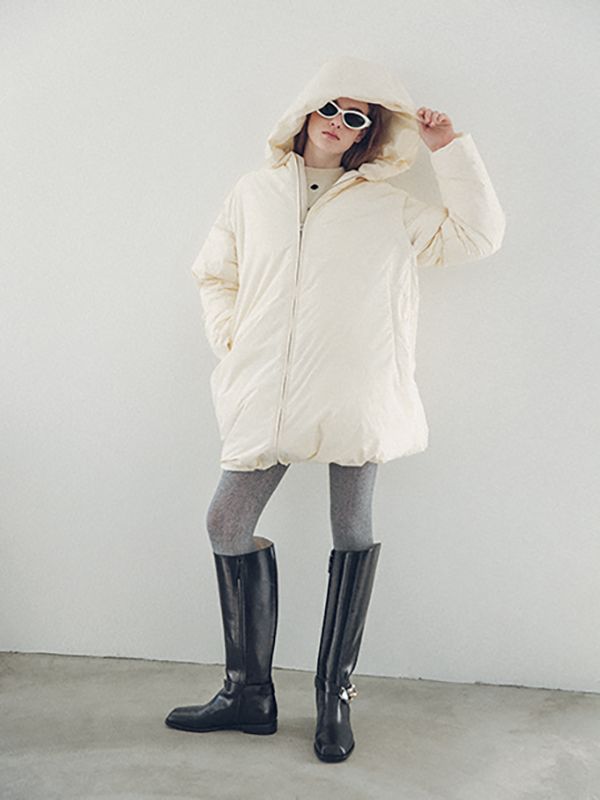 雪もちらつく予報すら出ている週末には、アウトドア過ぎないタウンユースなダウンジャケットとブーツが必須。大きなフードで小顔効果も期待できる、体を包み込むようなダウンコートは真冬に似合うエクリュカラーをあえてチョイス。