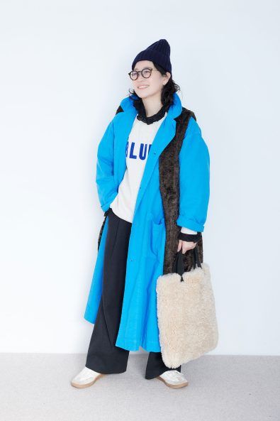 この日の主役は、なんといってもパッと目を引く鮮やかなブルーが印象的なコート。さらにブラウンのジレをプラスしているのがポイントです。