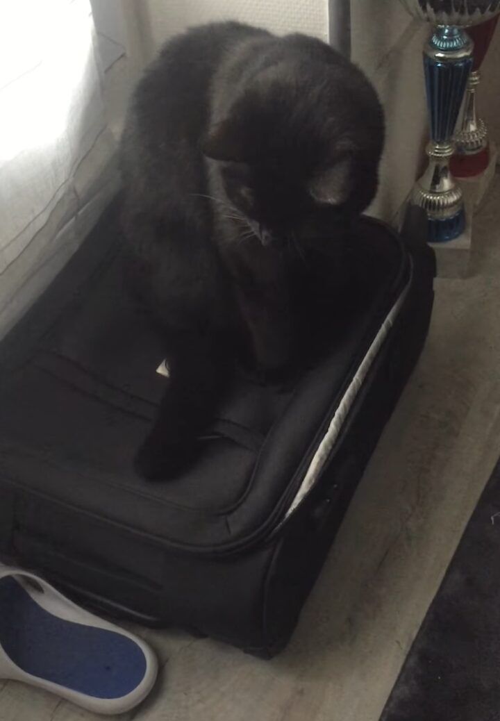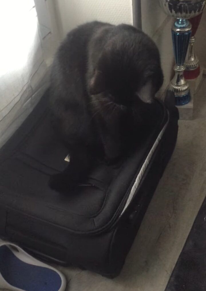 スーツケースの上で座っている黒猫。 くつろいでいるだけのようにも見えましたが、実はとんでもないイタズラの最中だったんです!!