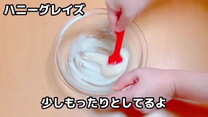 ハニーグレイズはボウルに粉糖とはちみつ、水を入れて混ぜ、ドーナツをつけるだけ。