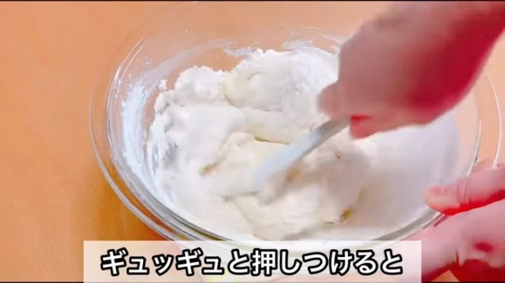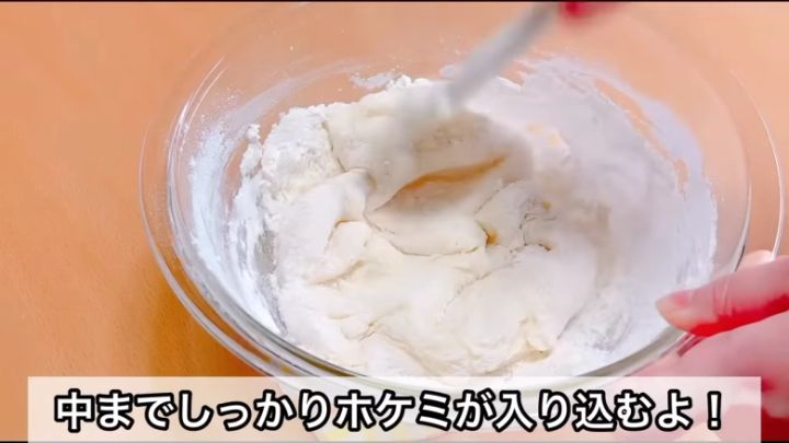 お餅をギュッギュッと押しつけるようにすると混ざりやすくなるそう!お餅をひっくり返して押しつけるという流れを繰り返し、中までホットケーキミックスが入るようにしましょう。どうしてもまとまらないときは、大さじ1ほどの水を足してみてくださいね。