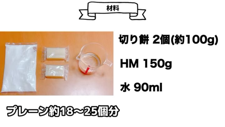 プレーンの材料は、なんとこれだけ!お餅とホットケーキミックスがあれば、おいしいドーナツが作れちゃいます。
