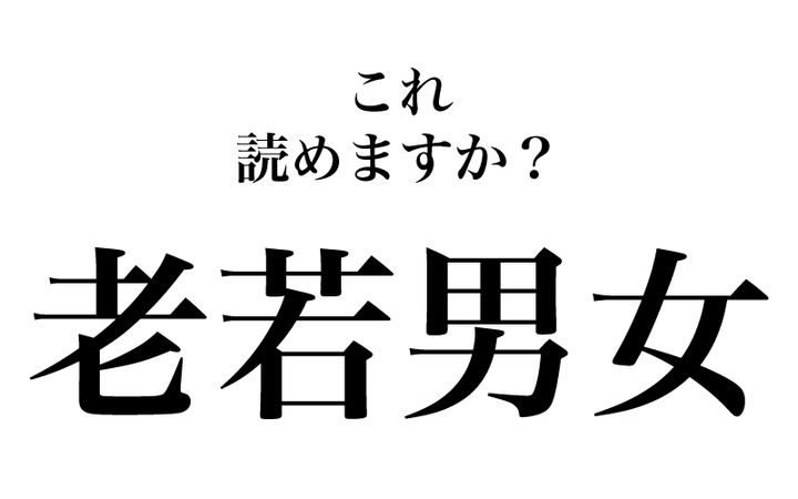 最初は、「老若男女」です。四字熟語として何と読むでしょうか? 例文は「老若男女が一堂に会する」。「ロウジャクダンジョ」ではありません。