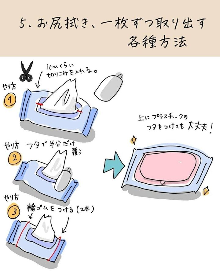 さらに、おしりふきの両端に輪ゴムを取り付けることでも、おしりふきを1枚ずつ取り出せるようですよ。困ったときはいずれかの方法をお試しください。