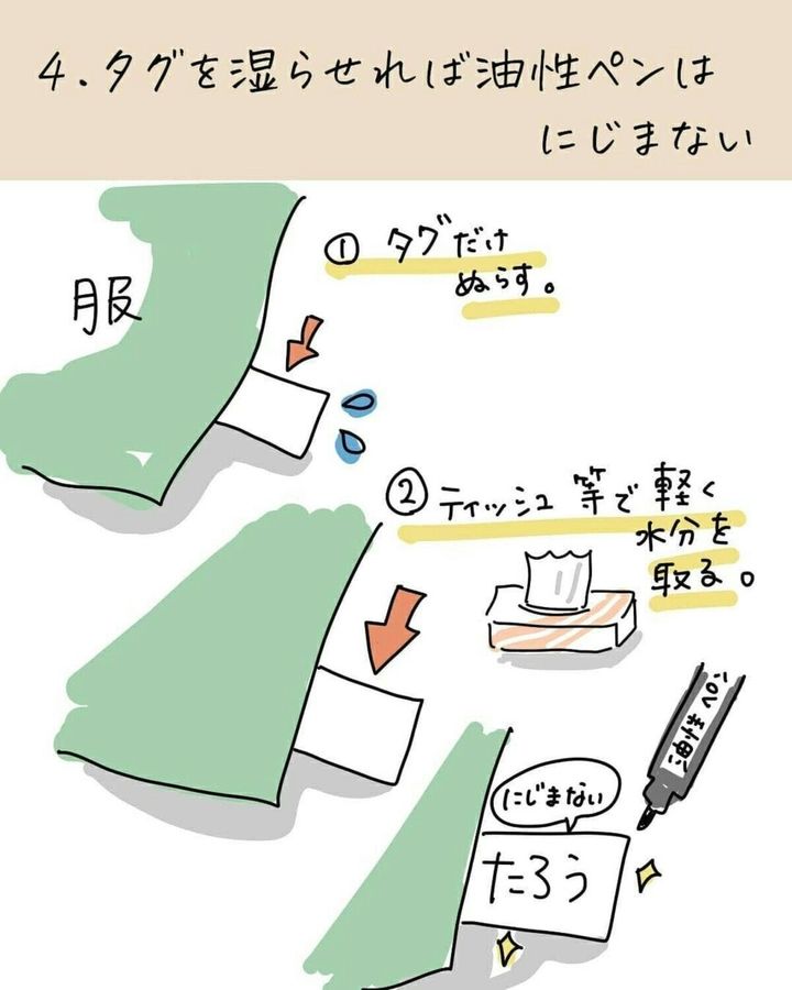 そんなときは、タグだけをぬらして湿らせ、ティッシュなどで水分を拭き取ってから、油性ペンで名前を書きます。すると、にじむことなくきれいに書くことができるとのこと。知っておいて損はない裏技です。