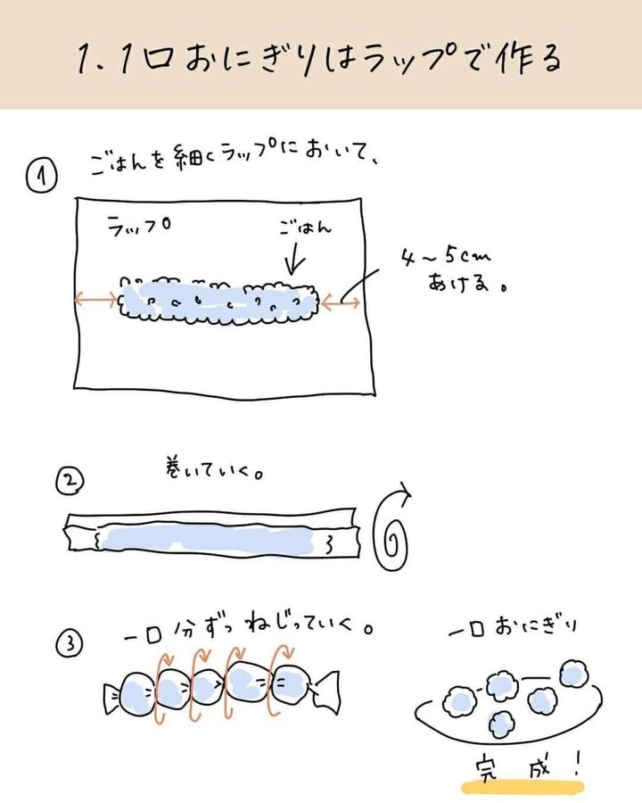 子どもが小さいうちは一口おにぎりを作る機会が多いはず。この裏技を使えば量産できるので、一つずつ握ると手間が省けて時間短縮になり、助かりますよね。