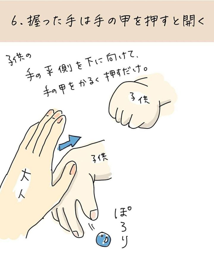 もし子どもが手をギュッと握りしめていたら、子どもの手のひらを下に向け、手の甲を軽く押してみてください。子どもに痛い思いをさせることなく、簡単に手を開くことができるそうですよ。