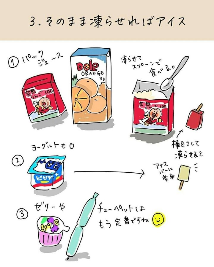 普段飲んでいるパック入りジュースを冷凍庫で凍らせると、アイスとして楽しめるとのこと。いつもとはまた違った味わいになって楽しいですよね。