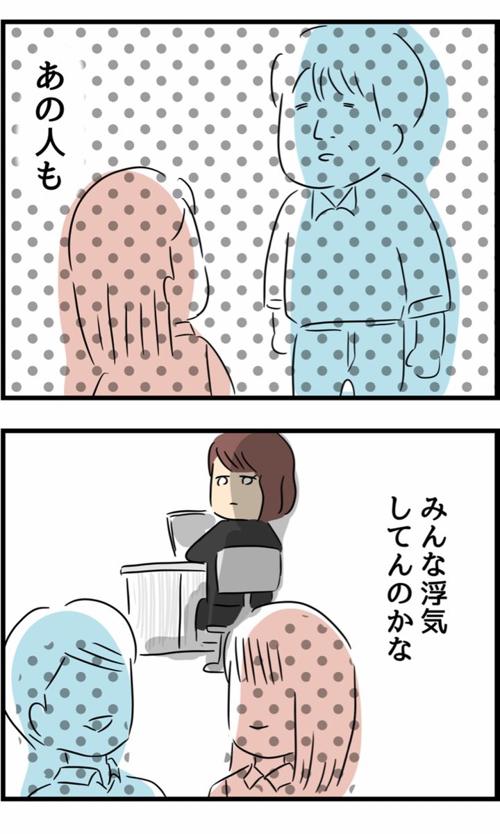 夫に不倫されてしまったリナさん。離婚を切り出すも、決着がつきませんでした。重い気持ちを引きずったまま出社したリナさんは、まわりの人も疑いの目で見てしまいます。すると、後輩から「あの人とあの人、不倫してますよ」と告げられます…。