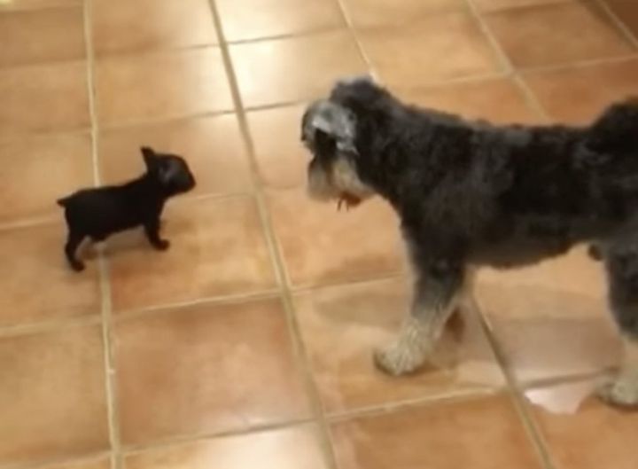 3. 「わぁ、とっても小さい子!」子犬に戸惑う大人ワンコ。
