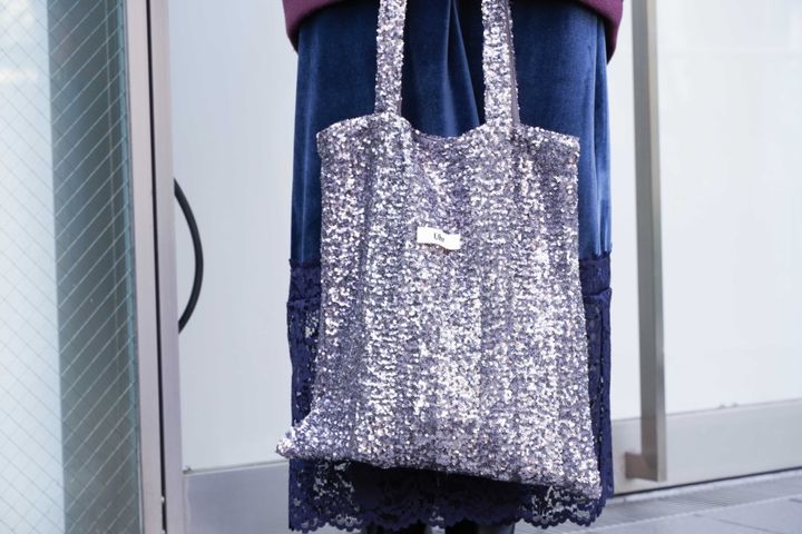 「デイリーに使えるサイズ感もちょうどよく毎日愛用中。贅沢に隙間なく敷き詰められたスパンコールで一気に華やかな印象に!」バッグ¥6,160(ウーア)