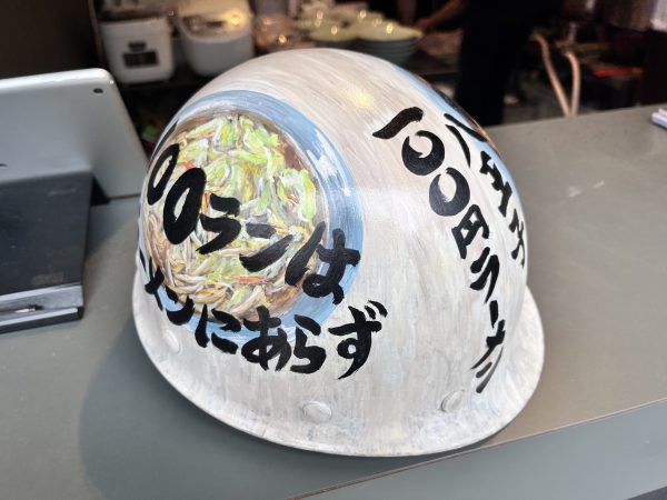 ラーメンとライスの注文は窓口で食券を購入し、ラーメンができたら食券と引き換えというスタイルです。窓口にはとっても個性的なヘルメットが置かれていました!