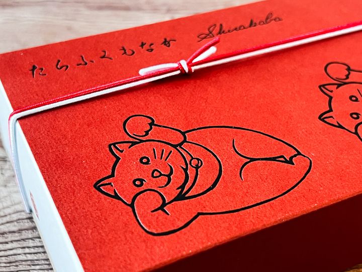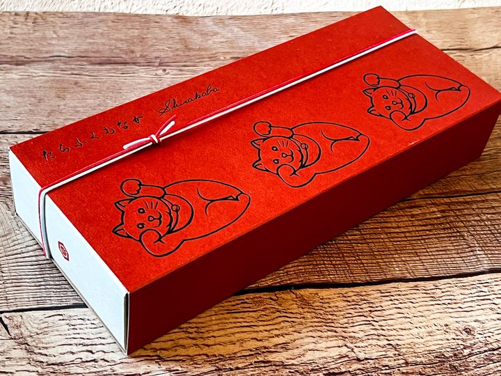 赤い外箱には、横に寝そべった招き猫がプリントされています。紅白の紐もめでたい雰囲気。