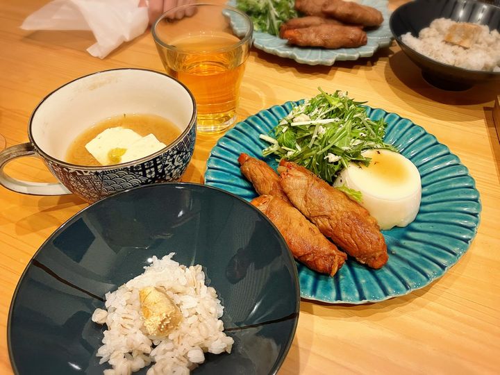 実母の作ってくれたおかずと、夫の作ってくれた味噌汁をよそって、サッと夕飯の準備が完了♪夕飯時、息子たちからは「ママだけズルい」「オレもひぃばぁば家行きたい」とクレームの嵐だったので、来月は子どもたちも一緒に訪問予定。