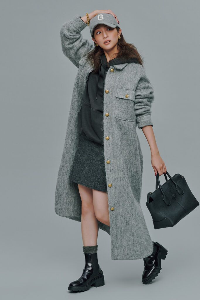 コート¥99,000(THIRD MAGAZINE)フーディ¥22,000(スローン/ザショップスローン新静岡セノバ店)スカート¥25,300(ザシンゾーン/シンゾーンルミネ有楽町店)帽子¥12,100(グッドグリーフ/アパルトモン神戸店)バッグ¥322,300ブーツ¥119,900(ともにトッズ/トッズ・ジャパン)イヤリング¥12,600(アビステ)ブレスレット¥9,350(インムード/フォーティーンショールーム)靴下/スタイリスト私物