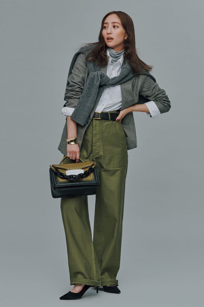無地のグレーが多い中、柄を取り入れるとオシャレ度UP。カーキもグレイッシュな色味でグレーとなじみよし。マニッシュに引き寄せて。