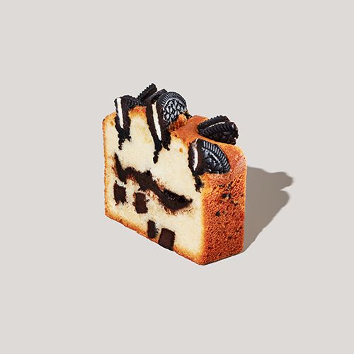 バニラ風味の生地にチョコレートを入れ、ビターなブラックココアクッキーを大胆にトッピングしたパウンドケーキです。