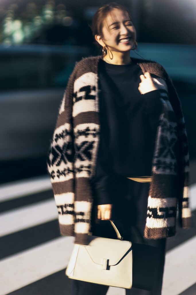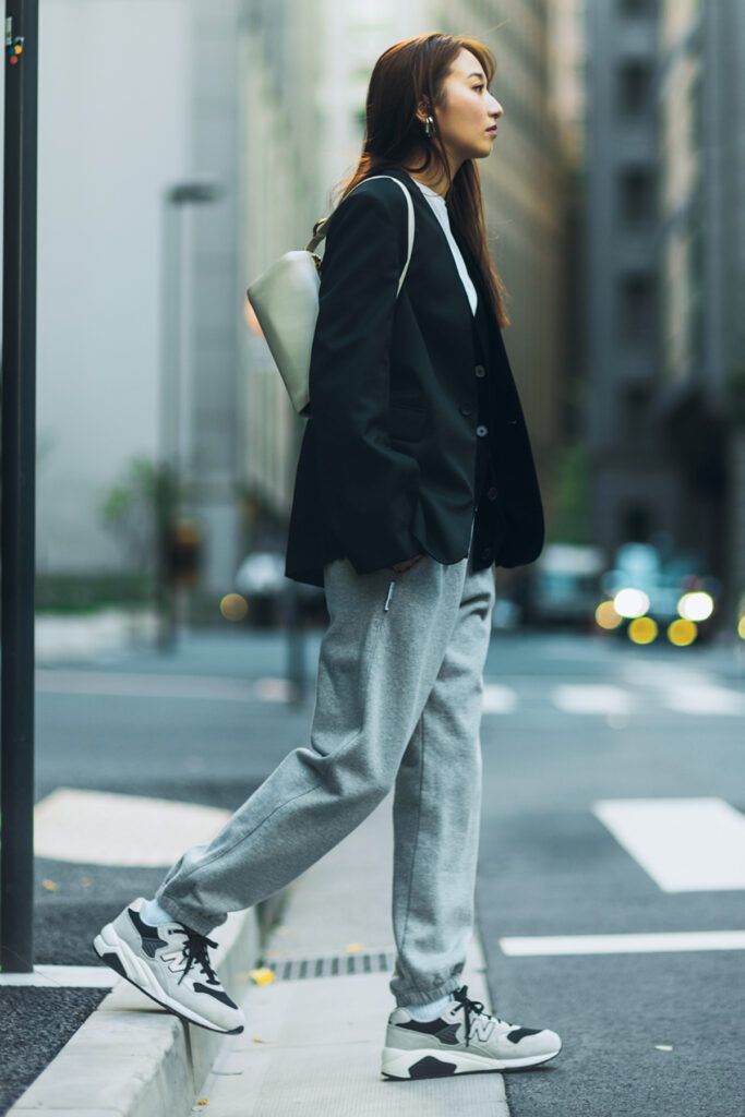 ジャケット¥39,930(リネイヴ/オンワード樫山)カーディガン¥15,000(バナナ・リパブリック)カットソー¥8,250(ハウント/ハウント代官山/ゲストリスト)スウェットパンツ¥27,500(オートリー/トヨダトレーディングプレスルーム)バッグ¥17,990(ザラ/ザラカスタマーサービス)ソックス(3Pセット)¥1,760(フルーツオブザルーム/ギャレット)ピアス¥16,500(イリス47/フーブス)スニーカー¥18,700(ニューバランス/ニューバランスお客様相談室)
