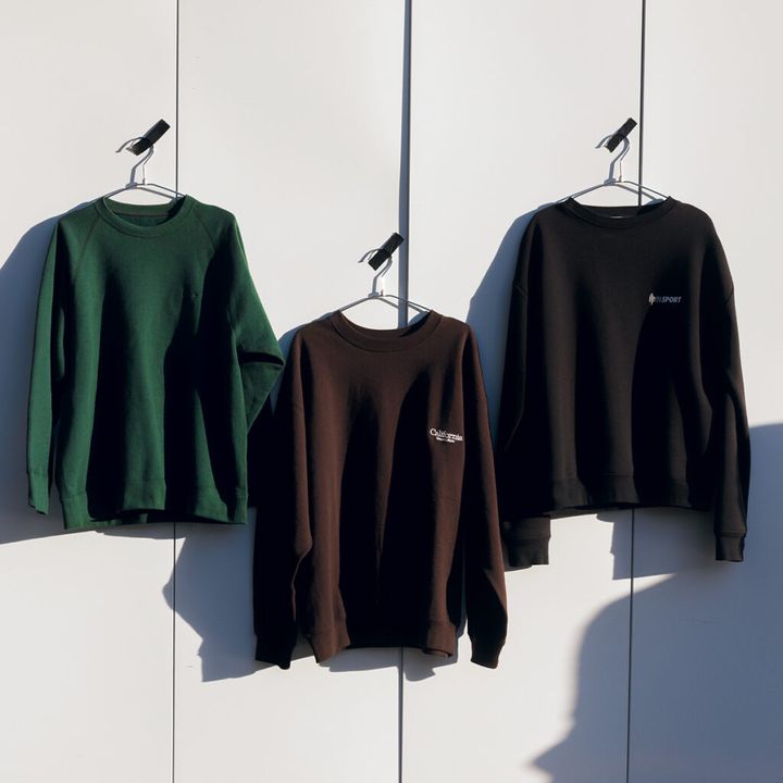 コンパクトすぎない形を選ぶのも今っぽく仕上げる秘訣。ダークカラーなら大人見えも。右から/スウェット¥29,700(オペラスポーツ/ショールームウノ)スウェット¥14,300(カリフォルニア ジェネラルストア/カリフォルニア ジェネラルストア)スウェット¥28,600(エイトン/エイトン青山)