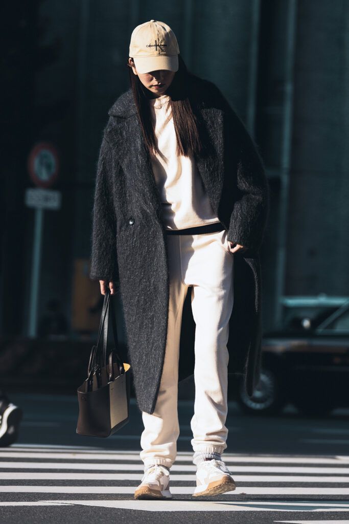 黒やネイビーに比べ、女らしくこなせるベージュスウェット。締め色ニットのレイヤードでメリハリをつけてバランスよく。スウェットトップス¥15,400スウェットパンツ¥16,500(ともにLIFiLL)コート59,950リブニット¥16,940(ともにアンクレイヴ/オンワード樫山)キャップ¥7,700(カルバン・クライン/カルバン・クライン カスタマーサービス)レッグウォーマー¥2,990(ザラ/ザラ カスタマーサービス)バッグ¥185,900(トッズ/トッズジャパン)スニーカー¥6,590(ザラ/ザラ カスタマーサービス)