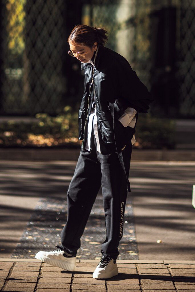 クリーンな白シャツを挟んできちんと感を。ブルゾン¥42,900(アッパーハイツ/ゲストリスト)シャツ¥2,990タートルニット¥2,990(ともにユニクロ)スウェットパンツ¥15,400バッグ¥19,800(ともにカルバン・クライン/カルバン・クライン カスタマーサービス)ソックス(3Pセット)¥1,760(フルーツオブザルーム/ギャレット)メガネ¥38,170(オリバーピープルズ/ルックスオティカジャパン カスタマーサービス)スニーカー¥72,600(ホーガン/トッズ・ジャパン)
