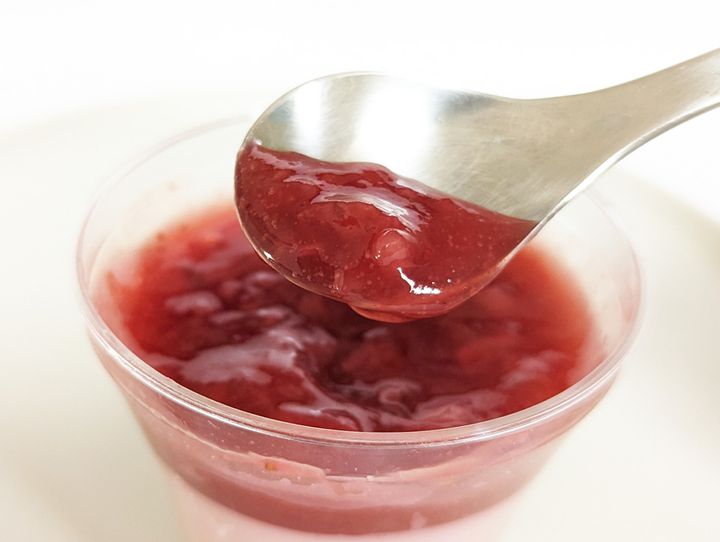 ピンク色のみるくいちご寒天の上に、いちごソースがたっぷりとトッピングされています。まずはソースだけを味わってみました。
