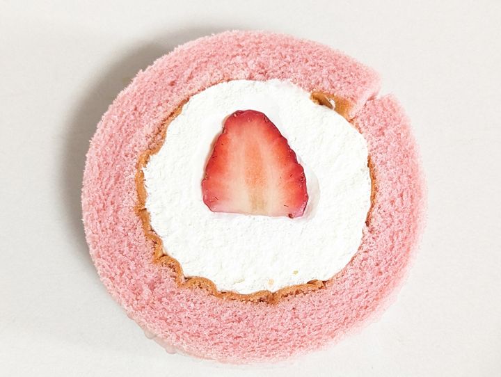 ホイップクリームをピンク色のスポンジで囲み、真ん中にハーフカットのいちごがトッピングされています。