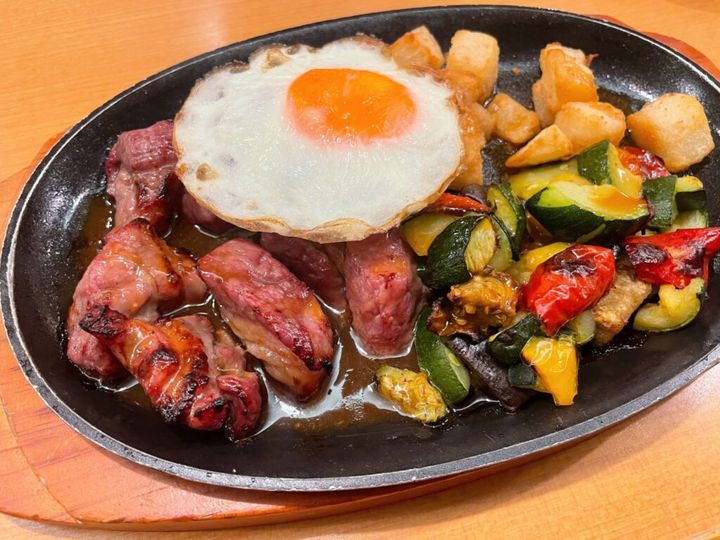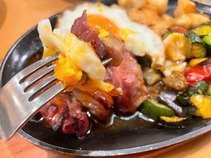 ラム肉と目玉焼きを一緒に食べると、まろやかな味に。クセが少ないとはいえ、ラム肉である以上多少の香りがあるものですが、その香りを玉子がマイルドにしてくれました。甘辛ソースをたっぷりと絡めて食べると、より美味しくいただけます。