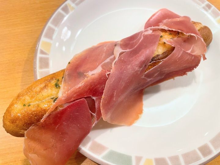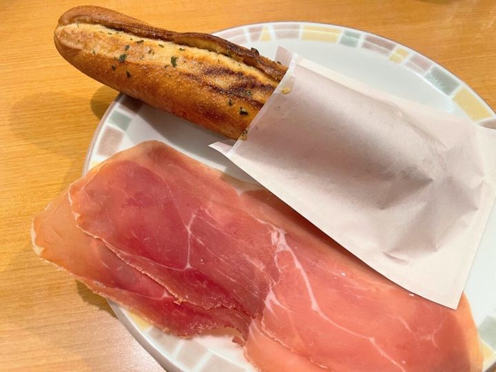 生ハムと一緒に頼んだのは「ガーリックトースト(¥200)」。サイゼリヤのガーリックトーストはそのままでも美味しいのですが、生ハムをトッピングすることでより美味しくなりそうとふんで、さっそくトッピングしてみました。