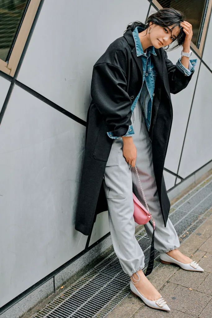 堅実な黒コートのマンネリ感を解消するには、目に留まりやすい顔まわりの印象から変えるのが近道。Gジャンのラフな空気感を添えると、肩の力の抜けたカジュアルムードが漂います。カジュアルなスウェットパンツに、ほどよく肌見せできるキレイめパンプスを合わせてMIX感を楽しんで。