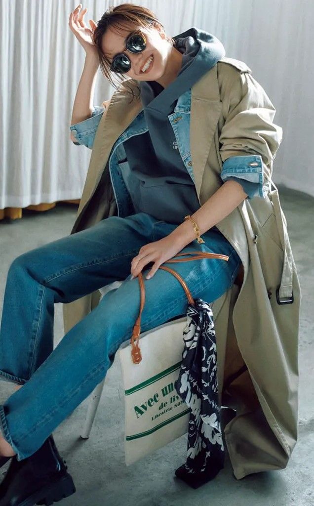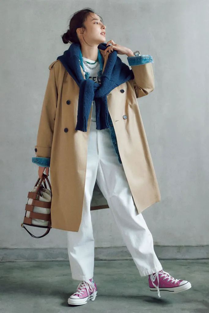 Gジャン、トレンチコート、白デニム・・・ベーシックをとことん掛け合わせるだけで、一気に今っぽいスタイルが完成します。鮮やかカラーのスニーカーとひと癖バッグで、コーデにエッジを効かせるのがオシャレ見えのコツ。アウターの上からニットを肩がけする余裕感も忘れずに。