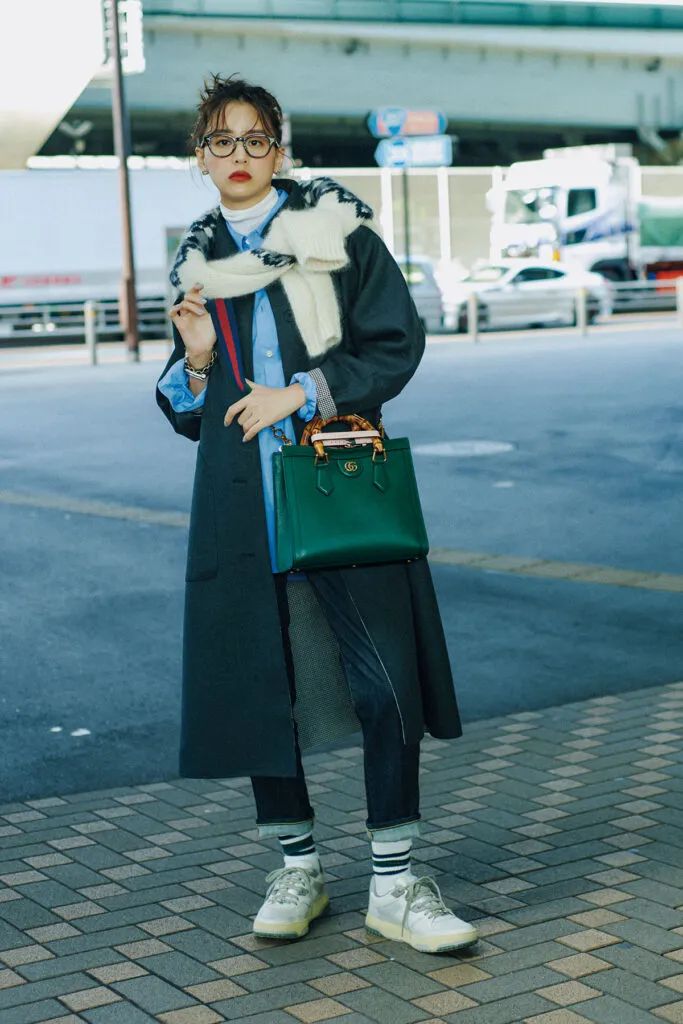 タートルネックにブルーシャツ、黒コートを重ねた大人のレイヤードスタイル。さらに上からニットを肩がけすれば、こなれ感が倍増。個性派バッグと柄ソックスで、ちょっぴりスパイスを効かせて。