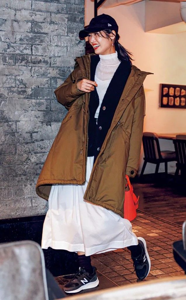 毛足長めのモヘアカーディガン×ダウンコートの重ね技が新鮮味たっぷりな甘辛MIXコーデ。ほどよく肌見えできるシアータートルのおかげで、重ね着ルックでも着ぶくれ感ゼロ。スニーカーとキャップを合わせて、大人カジュアルにまとめて。