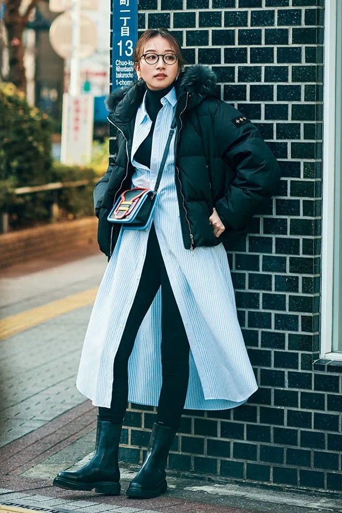 いつものダウンジャケット×パンツコーデも、中にロング丈シャツを仕込むだけで雰囲気が一変! オールブラックに映えるブルーストライプが、大人の余裕とほどよい遊び心を演出します。シャツのボタンはラフに外して、こなれたムードに仕上げて。
