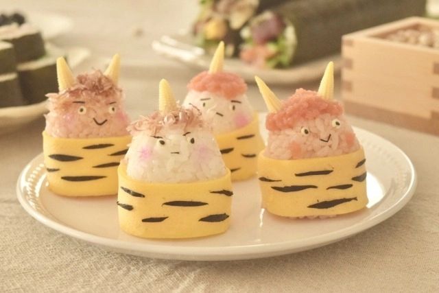 まず、小さく縦長に作ったおにぎりに、薄焼き卵をくるくると巻いて鬼の服を作ります。海苔やチーズで鬼の顔や服の柄を作りましょう。そしてかつお節やたらこの髪の毛を頭にのせ、ツノに見立てたベビーコーンを挿したら完成♡簡単でかわいい鬼のおにぎりです。