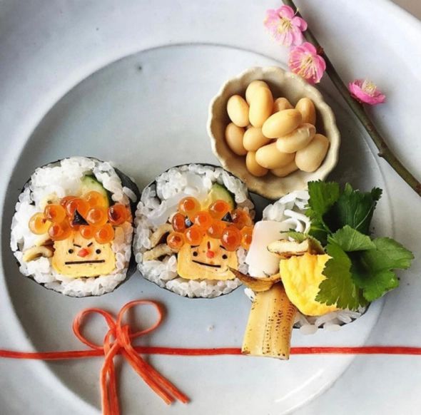 卵焼きやきゅうりなどを上手く並べてご飯と海苔で巻いて、一口サイズにカット。細く切った海苔やカニカマ、いくらをデコレーションしてかわいい鬼を作られています♡ぜひ、お子さんがいる人は参考にしてみてくださいね。