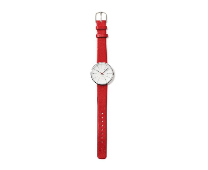 デンマークの巨匠、アルネ・ヤコブセンがデザインした腕時計。1本のラインのように見えるインデックスは、小さな12個のブロックで時間をグラフィカルに表現している。¥34,100(イデーショップ ヴァリエテ 渋谷店 TEL:03・6434・1641)