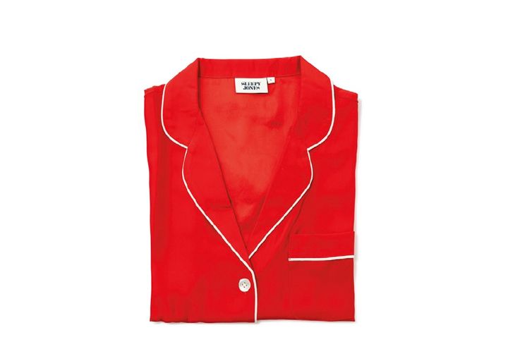 ビビッドな赤に、スリムな白のパイピングがアクセント。なめらかな肌ざわりがやみつきの、シルク100%のパジャマシャツ。同素材のパンツもあり。¥39,600(スリーピー・ジョーンズ/モットハウス・トーキョー TEL:03・6325・2593)